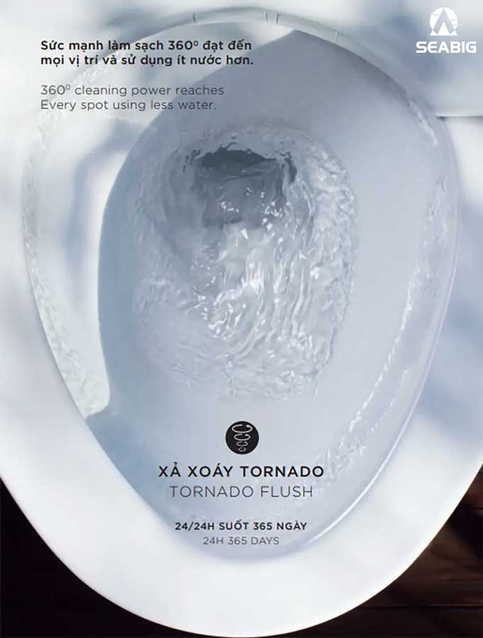 - Lực xả mạnh mẽ: Thay vì xả truyền thống từ các lỗ nhỏ dưới vành, công nghệ Tornado Flush (Xả xoáy) tạo ra một luồng nước xoáy 360 độ cực mạnh mẽ, quét sạch mọi vết bẩn bám trên lòng bồn cầu.