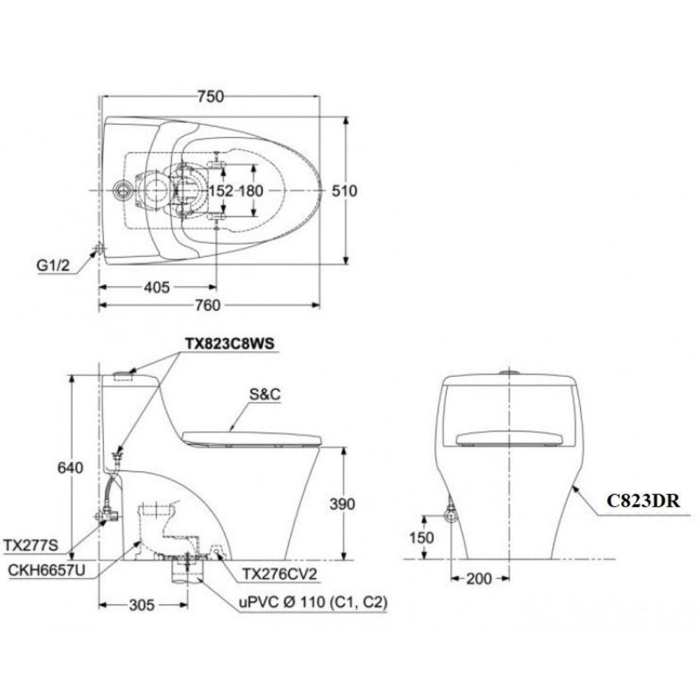 Bản vẽ bồn cầu TOTO C823DR nắp cơ TCW1211A 1 khối